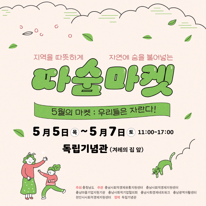 충남사회적경제지원센터와 독립기념관은 사회적 경제 활성화를 위해 어린이날이 있는 따뜻한 주말, “따숨마켓” 행사를 개최합니다.