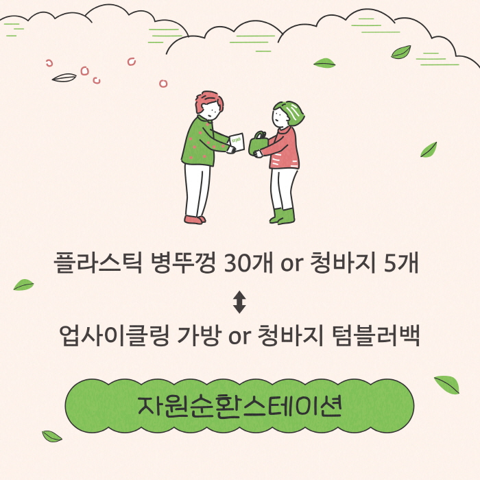 ※ 플라스틱 병뚜껑 30개 또는 청바지 5개를 가져오시면 업사이클링 가방 또는 청바지 텀블러백으로 교환해 드립니다.