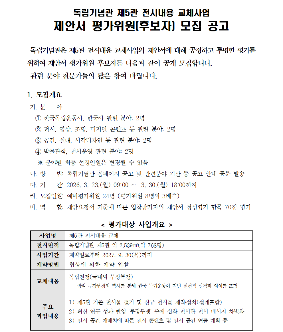 독립기념관 제5관 전시내용 교체사업 제안서 평가위원(후보자) 모집 공고