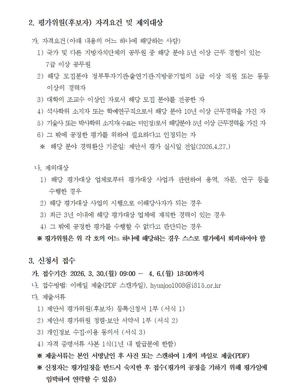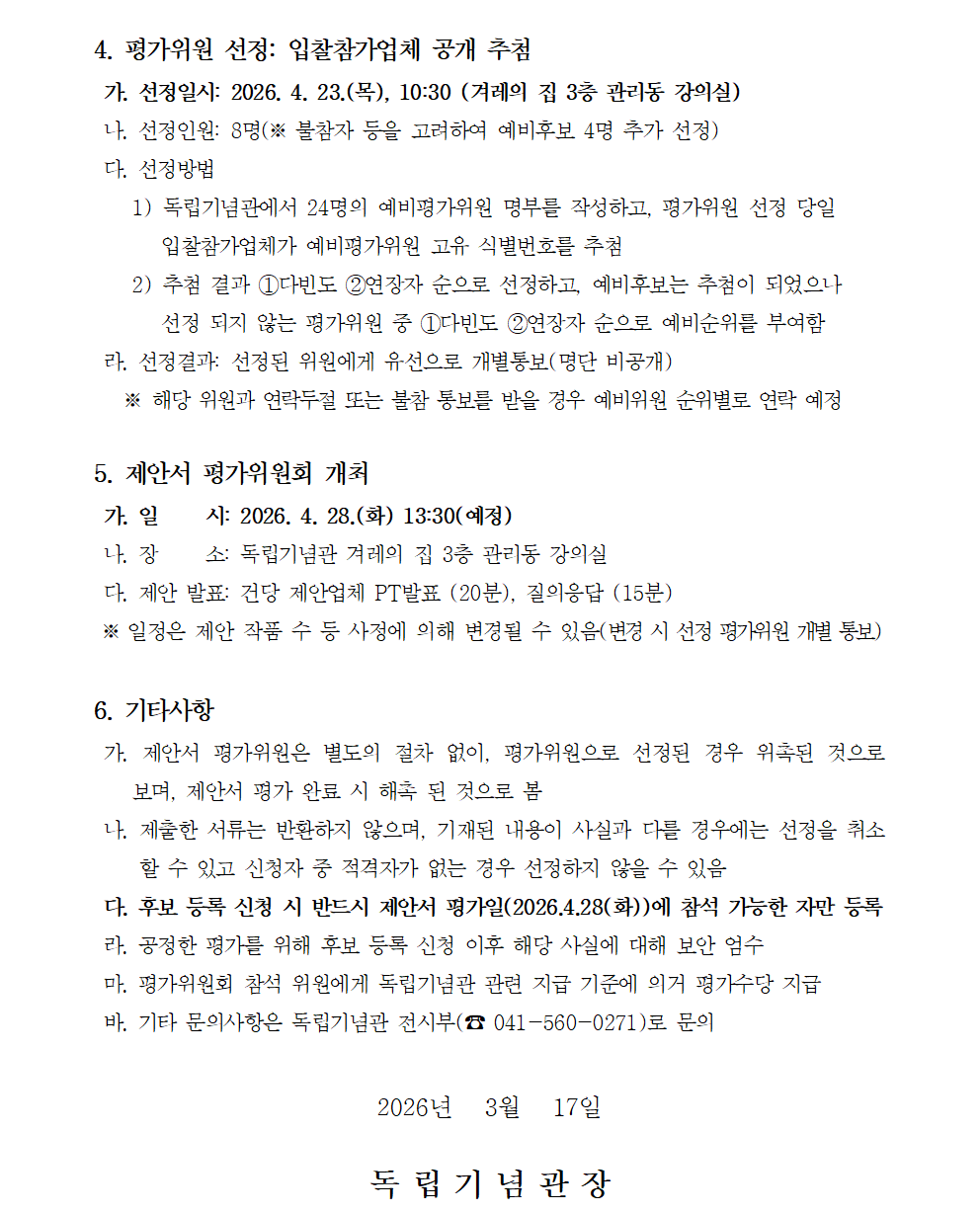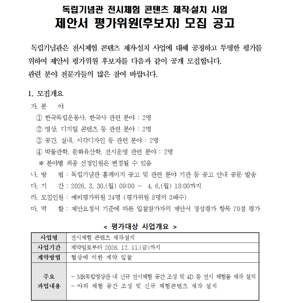 독립기념관 전시체험 콘텐츠 제작·설치 사업 제안서 평가위원(후보자) 모집 공고