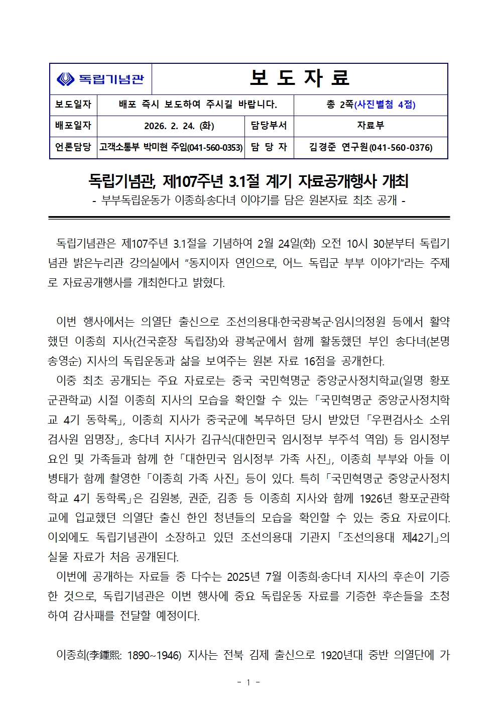 독립기념관, 제107주년 3.1절 계기 자료공개행사 개최.hwp